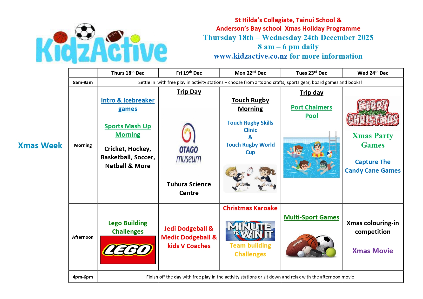 Our holiday programmes are based out of Andersons Bay School, Tainui School, Edgar centre, St Hilda’s Collegiate.